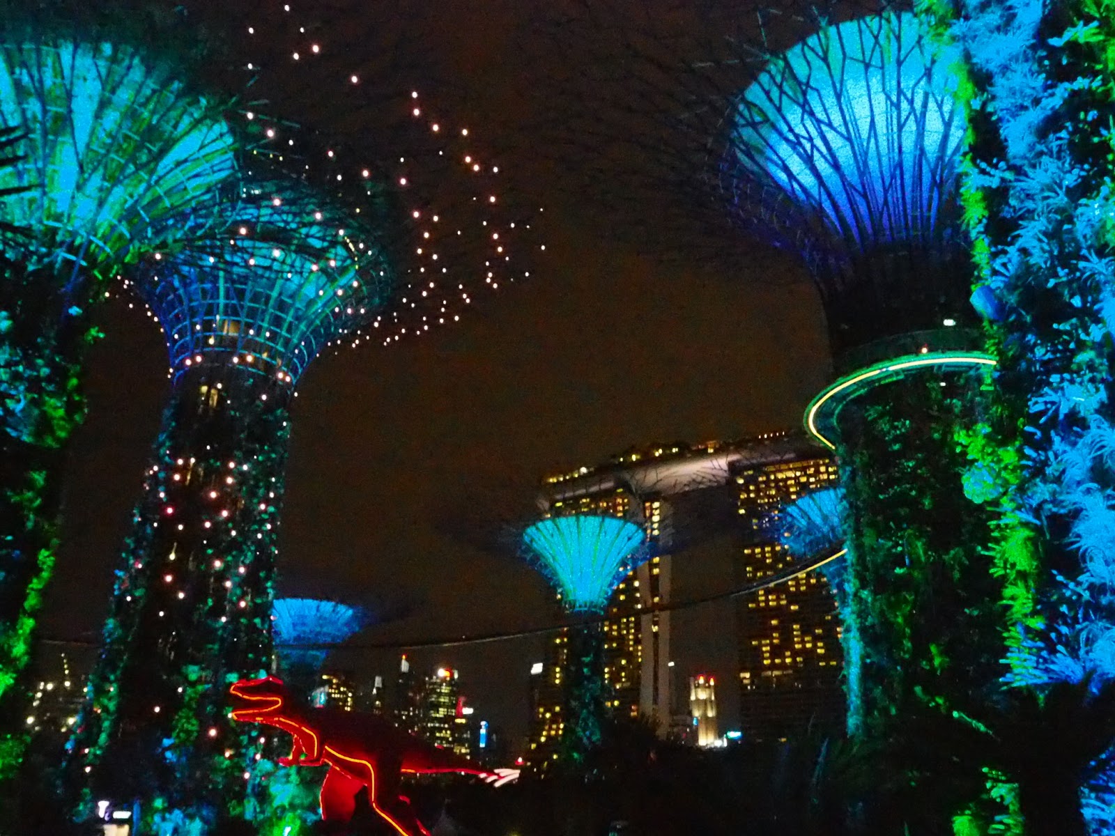 Gardens by the Bay, que es un jardín botánico formado por 2 cúpulas ( 28 dólares la entrada)y todo el espacio que rodea los Supertrees, que es gratuíto ( y para mi gusto lo másbonito). Conectando dos de los supertrees está el OCBC Skywalk, que es una pasarela elevada que se supone que ofrece magníficas vistas de la ciudad. Digo se supone porque si hace mal tiempo lo cierran y como llovió todos los días, no conseguí subir.Además a las 7:45 y 8:45 en la zona de los supertrees hay el Rhapsody Show, que es un espectáculo de luz y sonido.